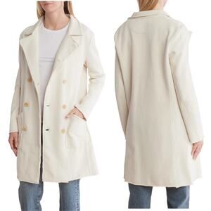 Elevate your off-duty wardrobe with this Frank & Eileen Belfast Trench Coat in soft Vintage White. Crafted from luxurious 100% cotton triple fleece, this midweight trench-style coat is soft yet structured, offering warmth without bulk. Features include a double-breasted front, raw edge seams, two oversized front patch pockets, and a notched collar. The relaxed fit and longline silhouette make it perfect for layering over tees, hoodies, denim, or activewear.