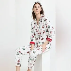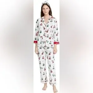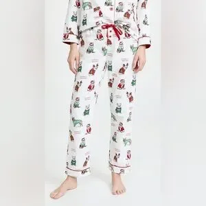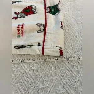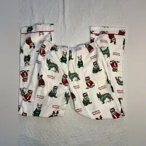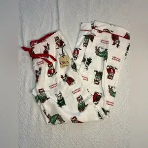 Brushed cotton flannel PJ set printed with winter-holiday dressed dogs. Relaxed fit top has buttons, patch pockets & cuff embroidery "Happy Howlidays". Roomy fit pant with tie waist. Add these soft and warm pj pants to your closet because who doesn’t love a good pair of super soft and super warm pajama bottoms? They come new with tags in a size XS!