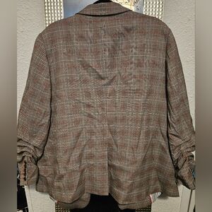 Elevate your style with the 1. State Women's Brown Plaid Blazer. This classic piece features a sophisticated plaid pattern, perfect for any formal occasion. The brown color adds a touch of elegance to your wardrobe. Has functional front pockets and ruched sleeves detail.