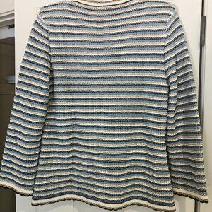 The ease of a cardigan, the polish of a jacket. Spun from Italian stretch cotton, the Ceriani boasts a deep-V neckline, an elongated silhouette, multicolor stripes and a scalloped hem. Flap pockets and enamel crest buttons complete the look. Wear with straight-leg pants and heels for the office, jeans and sandals for the weekend.