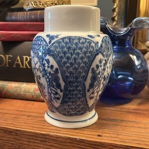 Elegant blue and white porcelain candle holder featuring a detailed peacock design. Perfect for adding a touch of sophistication to any room.