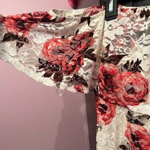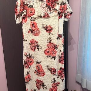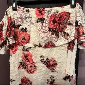 Elegant floral lace dress featuring a stunning red and white design. Perfect for any occasion. Can be worn off the shoulder or on. Brand new with tags. Size Juniors XL.