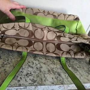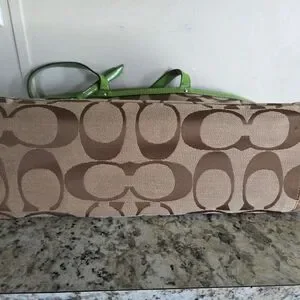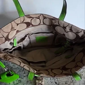 Stylish tote bag with a brown and green design. Can be used as a diaper bag too I've heard. Features a unique pattern and dual handles. Comes with green Coach tag and green skinny phone case. All shown. Has one flaw inside, blue ink stain, shown in pics. Great condition other than that. Lots of compartments.