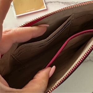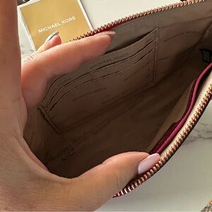 Stylish fuchsia clutch by Michael Kors. Features a luxurious gold chain strap. Perfect for any occasion.