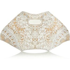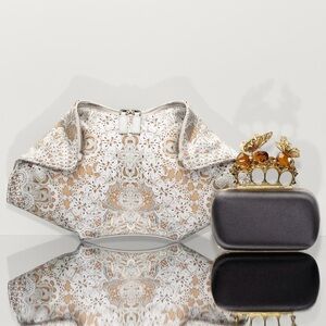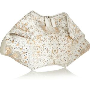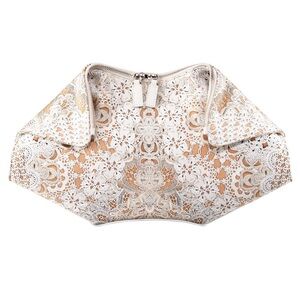 The print on Alexander McQueen's silk-satin 'De Manta' clutch is so realistic, at first glance it appears to be crafted from intricate crochet. This white leather-trimmed version is larger than the classic style, making it roomy enough to use by day as well as for evening.