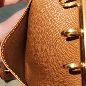 Small agenda with iconic monogram design. Features a secure button closure, snap works great. Inside rings in perfect condition, canvas looks great, no cracks on glazing or corners. Slight peeling in inside pockets but they aren't sticky.