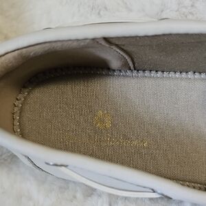 New! Elegant cream moccasins by Tommy Bahama. Perfect for casual wear. Beautiful neutral creamy gray color with silver accents around laces. Easy slip-on with fully cushioned footbed for extra comfort.