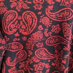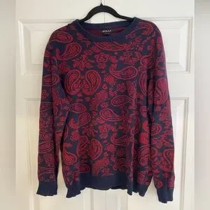 Stylish men's sweater with a bold red paisley pattern on a blue background. Comfortable and trendy design. Slimmer fit.