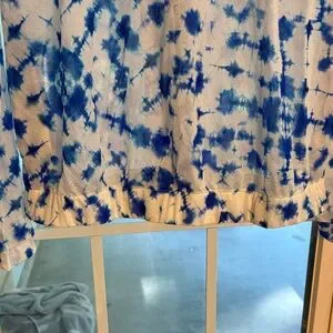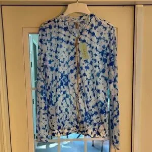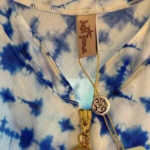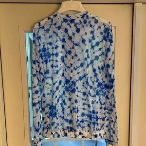 Stylish swim coverup by Luli Fama. Features a vibrant blue and white tie-dye pattern. Long sleeves with a front bold gold zipper.