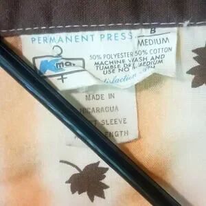 Vintage M 60s-70s KMart men's pajamas with a rockabilly bowler shirt look, contrasting collar, ombre ivory and orange stripes with chocolate brown leaves and collar. 50% cotton/50% polyester. 2 options with Scovill snaps at waist, elastic still seems good. Short sleeved, well made.