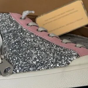 Shimmering silver sneakers with pink details. Lace-up style. Trendy and comfy.
