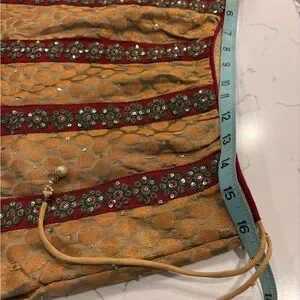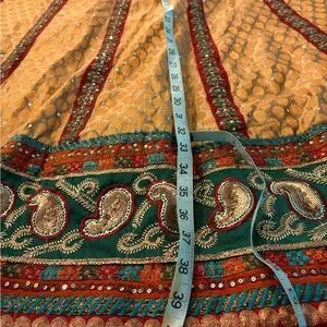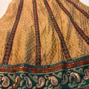 Vintage previous loved. This elegant skirt features intricate embroidery in rich gold, burgundy and green hues. Perfect for adding a touch of sophistication to any outfit or to use for a costume. The fabric is just beautiful. The waist is tiny and the skirt is full. Please watch the measuring tape.