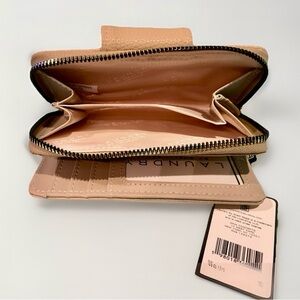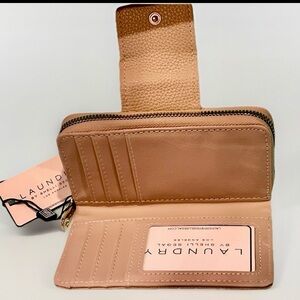 Elegant tan wallet by Laundry by Shelli Segal. Features a gold logo plate and textured design.