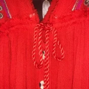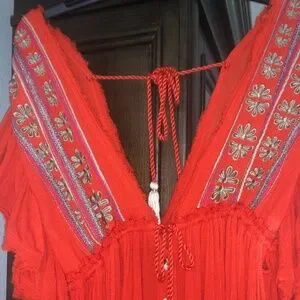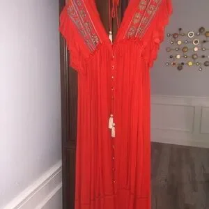 Very nice and good condition boho Free people dress, color dark orange. Beautiful detail in the front, size M, adjustable in the waist. Small discoloration see pictures, can’t hardly find it since is on the side under armpit. Dress has an adjustable string/tassel at the waist.