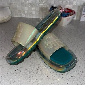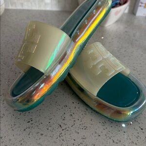 Chic sandals with iridescent straps. Vibrant turquoise footbed. Ideal for everyday style. These are so flattering, comfortable and beautiful! They were just a bit too small for me so I got a Sz 7. The color matches everything. They are in EUC only flaws are a few scuffs that are hard to see in pics and when wearing them. Smoke free home. They were only worn twice.