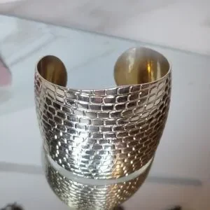 This elegant cuff bracelet features a stunning silver and gold textured design, perfect for adding a touch of sophistication to any outfit.