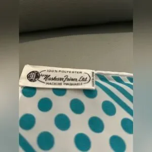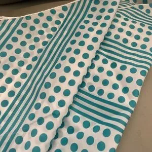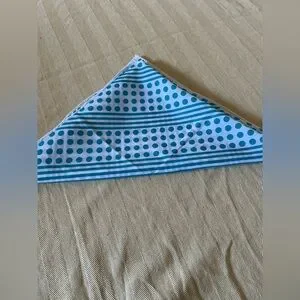Stylish scarf with teal polka dots and stripes. Perfect for adding a pop of color.