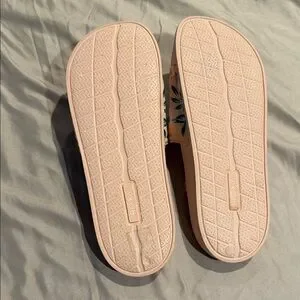 Roxy sandals with vibrant floral pattern. Cream base with pink and multicolor accents. Ideal for summer outings.