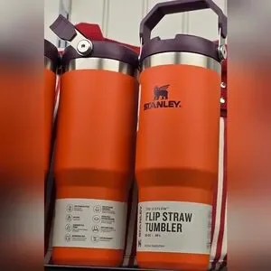 Bold orange Stanley mug with a striking purple lid. Ideal for travel and daily use.