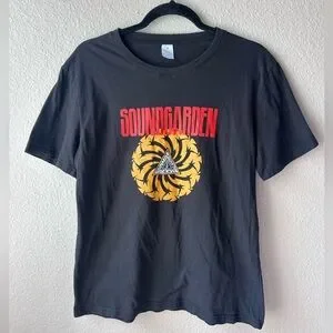 This is a black, short-sleeved Soundgarden "Badmotorfinger" graphic band tee. The shirt features the band's name in red text above a circular graphic with a yellow and black design, reminiscent of the "Badmotorfinger" album art. It's a classic piece of music merchandise, perfect for fans of 90s grunge and alternative rock. The shirt is in good condition.