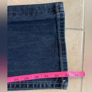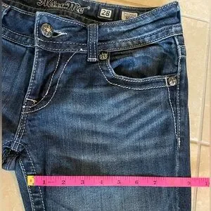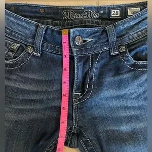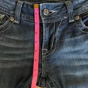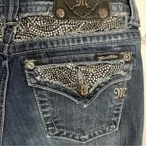 Chic boot cut jeans with rhinestone details. Classic blue denim. Long inseam. Perfect for casual wear.