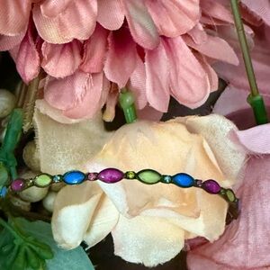 This vintage handcrafted Sorrelli bangle is so pretty with its vibrant cabochons and delicate high quality crystals. Wear alone or stack with your favorite bangles, you’ll enjoy wearing this lovely Sorrelli bangle.