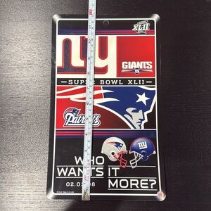 Super Bowl XLII Commemorative Plaque Sign. Commemorative plaque featuring Super Bowl XLII design with team logos and colors. Please refer to photos for exact size, details, and condition.
