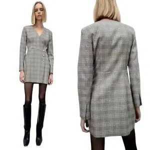 Beautiful Zara Black & White Plaid Wrap Front Rhinestone Button Blazer Mini Dress