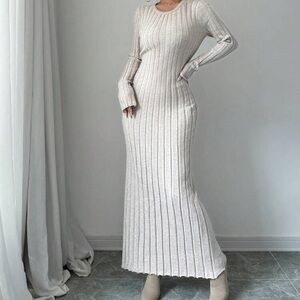 Step out in style with this elegant cream ribbed knit maxi dress. Perfect for any occasion, this dress offers a flattering fit and timeless design. Never worn