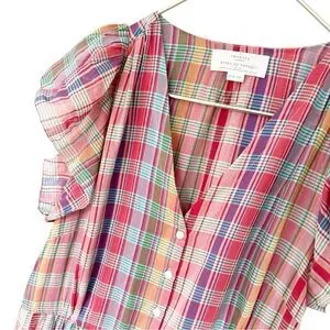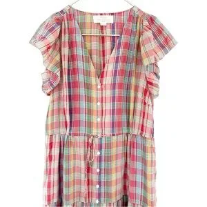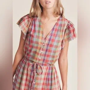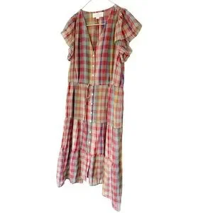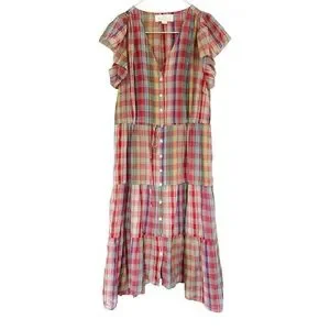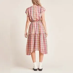 Trovata's Kristi Dress is made from a soft cotton with flirty ruffle sleeves, a handkerchief hem that hits mid-calf, a v-neckline, antique white buttons down the center front, a self-tie fabric belt to bring in the waist and create a feminine, in-seam side pockets, and a tapestry plaid print throughout