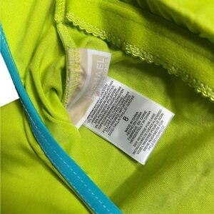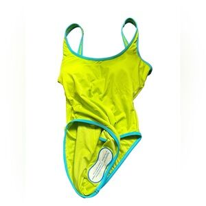 Hygenic liner intact. Neon with turquoise piping trim on suit.