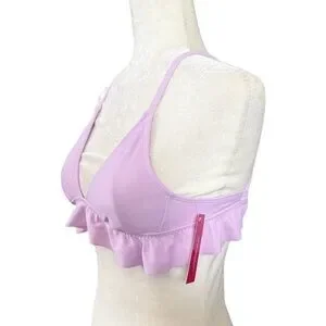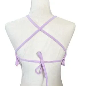 Stylish lavender bikini top with ruffle detail. Adjustable straps for comfort.