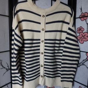 Stay stylish and comfortable with this striped cream and Blue sweater. Perfect for any casual outing.
