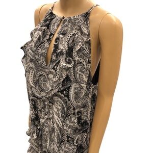The black and white paisley print gives a modern look to this classic Ruffle halter midi dress. Sleeves and full lined, it’s a dress that moves with you throughout your day, or as you dance through the night.