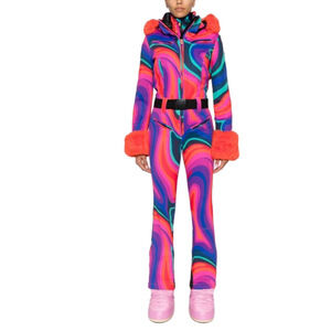 Eye-catching ski suit with a vibrant swirl pattern. Features bold red accents and a stylish belt, and fur collar/hood and sleeves.