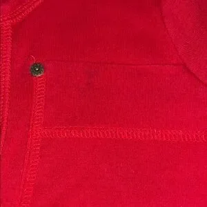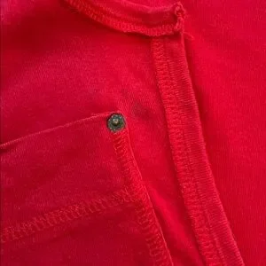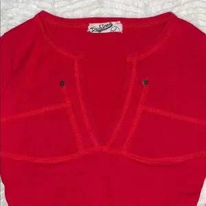 Such a cute top! Deep V cut with two front pockets. Rivet detail on pockets, top stitching, banded cuffs , rounded hem, thick jersey material. Two small marks as pictured, priced accordingly.