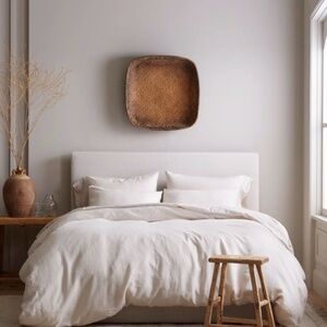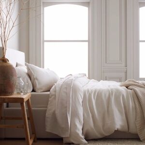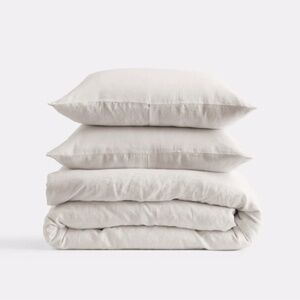 New with tag. Quince European Linen Light Tan King Duvet Cover with Two Matching King Pillowcases in Sand. Ethically woven from the finest European flax, this mid-weight linen flax duvet cover set offers year-round luxury and feels as good as it looks. Pre-washed for superior softness and a perfectly lived-in vibe, this linen only gets softer over time. Woven from 100% European flax. Duvet includes button closure and corner ties to keep comforter in place Interior ties to keep comforter in place. Made without the use of harmful chemicals or pesticides. Comes in a matching bag. Excellent clean new with tag condition.