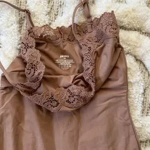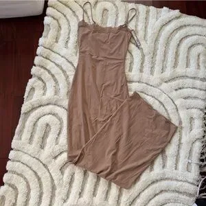 Elegant brown slip dress. Features delicate straps and lace trim. Perfect for layering or wearing alone.