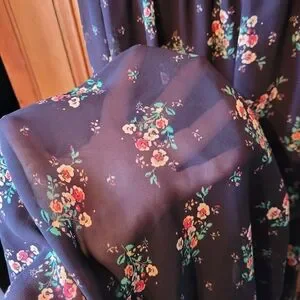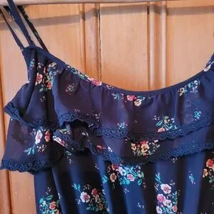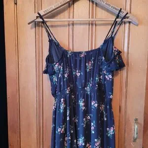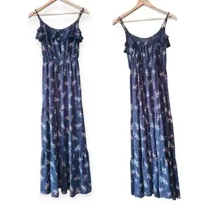 Elegant black maxi dress with floral pattern. Features ruffled neckline and adjustable straps. Perfect for any occasion.