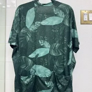 Dark green cycling jersey with bold leaf pattern, three rear pockets. Minimal wear, good condition.