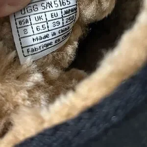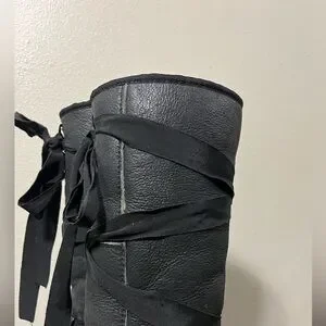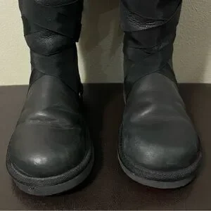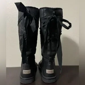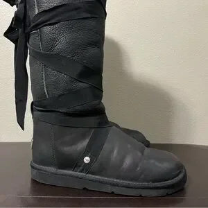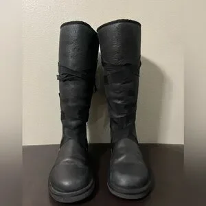 UGG Australia Tall Lace Ribbon Black Leather Sherpa Lined Boots Size 8