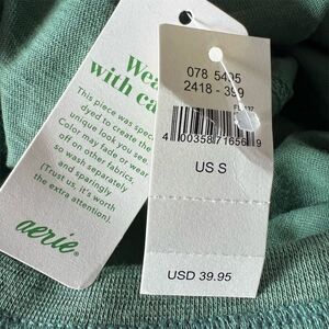 This Aerie women's Standard size S T-shirt is a basic style, featuring a crew neck and long sleeves. Made from 100% cotton, it offers a comfortable fit and is machine washable. The solid green color and graphic design make it suitable for casual occasions, especially during the fall season. Manufactured in Vietnam, this regular fit tee is new with tags. Keywords: Aerie, women's T-shirt, green, long sleeve, crew neck, casual, fall, graphic tee, cotton, machine washable, Vietnam, new with tags.