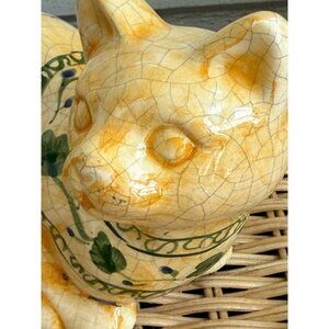 Vintage 70's Ceramic Cat Crackle Glaze Hand Painted Olive Branch