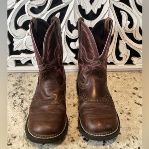 Justin Gypsy Cowgirls western boots, brown leather pull on round toe style in good condition. Pink trim detailed. Durable and comfortable thats perfect for work and play. I took many photos of all sides and angles to show wear and condition. Please see all photos. Smoke and pet free home.