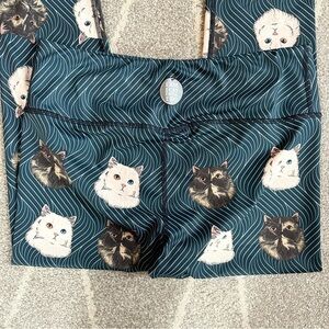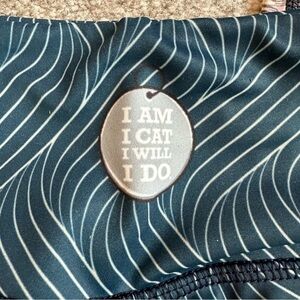 This fun pair of cat print leggings designed by the Peloton instructor Christine D’Ercole for Miami Fitwear are the prettiest color of deep peacock teal blue! At the top of the waist in the back, there’s even a cute cat tag that says “I am, I cat, I will, I do” as a fun play on Christine’s signature mantra. Never worn without tags. The previous owner loves cats but dresses more classic and they just never made it into her outfit rotation. Perfect condition. 15-20” across stretch waist, 28” inseam, 10.5” rise.