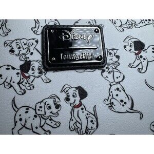 Adorable Loungefly Disney 101 Dalmatians mini backpack featuring an all-over Dalmatian puppy print on white faux leather with black trim. Front zip pocket with matching puppy zipper pull and spacious main compartment with polka dot lining and interior zip pocket. Gently used with minor wear inside see photos for details.