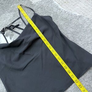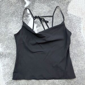 Elevate your style with this elegant black satin cowl draped neck camisole. Perfect for any occasion, this top offers a sleek and sophisticated look. Size 6. Love the tie back detailing. Great condition! :)