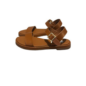 Steve Madden sandals in women's size 6M. The Aries style features brown faux leather with a buckle ankle strap. These sandals are in new condition, without the original box. There are no issues or flaws.