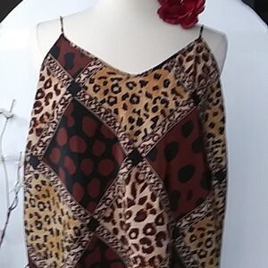 Very pretty animal print with floral vine borders nightie. This is an elegant nightie, but it is not delicate. It feels very well made and can be worn for everyday use. And yet, it is silky and beautiful and has a lovely sheen. The spaghetti straps are adjustable. The neckline is a rounded V and the hem has rounded slits at each outer thigh. The tags are missing but the fabric feels like polyester with no stretch. The measurements are consistent with a women's size 18/20. It is in like new condition with no signs of wear.