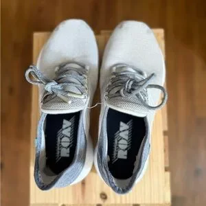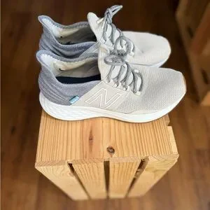 Women’s New Balance fresh foam beige and gray athletic shoes with a sleek design. Ideal for active wear. Comfortable and stylish. Wear inside by heel but original inserts unused. These wash easily in washer and air dry. Good condition.